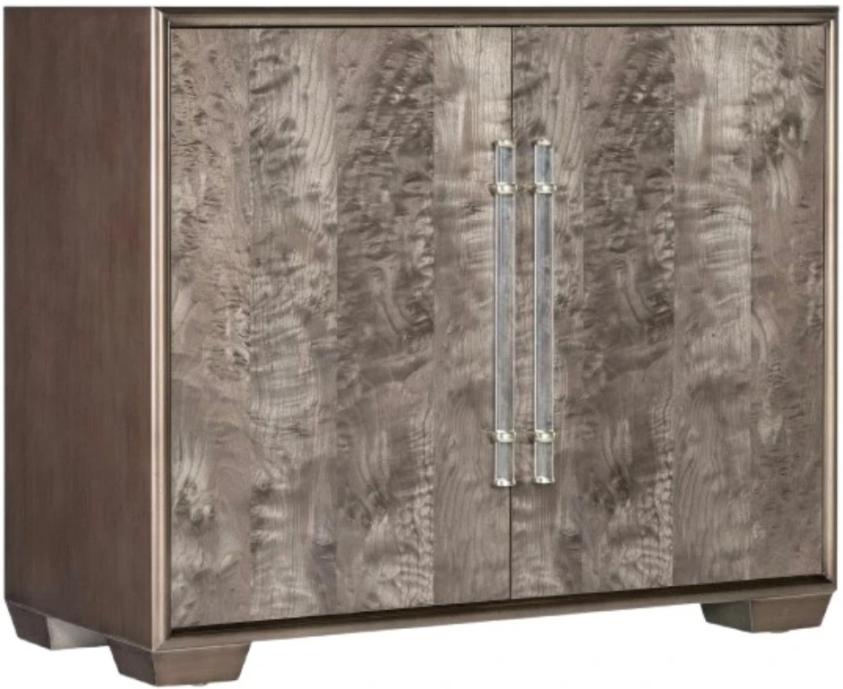 Finish: Shimmery wood finish on exterior with dyed brown burl veneer door fronts. Clear acrylic bar pulls with silver metal