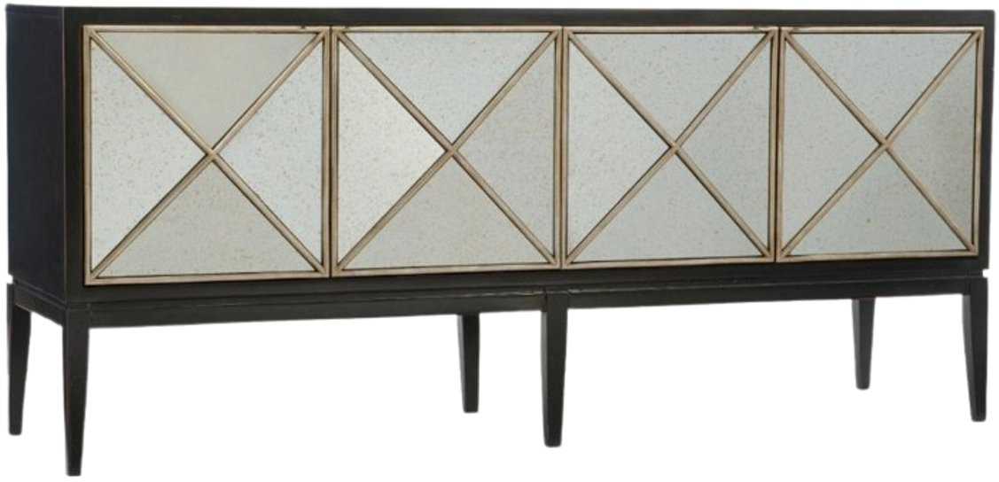 The Melange Jova credenza is crafted of birch veneers and antique mirror with gold and silver fretwork on the four glass doors. There’s one adjustable shelf behind each set of doors, and the doors have soft closing hinges. The finish on the outside of the case is a distressed black.Read More