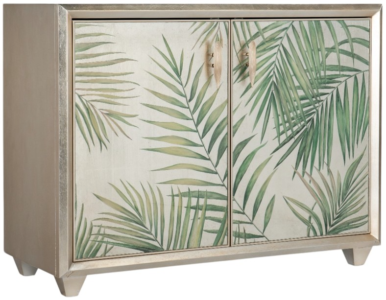 Strike an easy breezy tone with the Lets Be Fronds two door chest, featuring a gold leaf finish and a tropical design on two hand painted glass front doors. Crafted of wood and glass, there’s one adjustable shelf behind the set of doors and a ventilated back panel.Read More