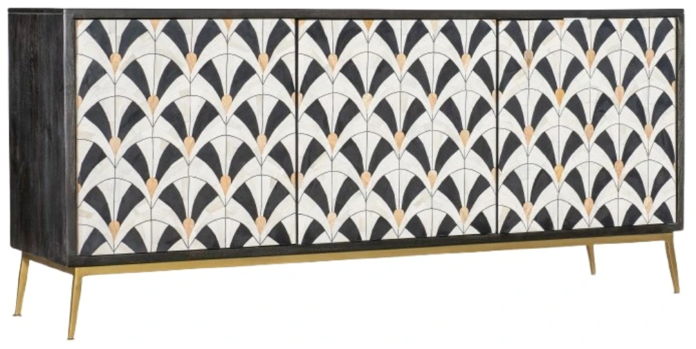 Finish: Black wood finish with white, beige and brown bone inlay on door fronts. Gold metal base and legs.