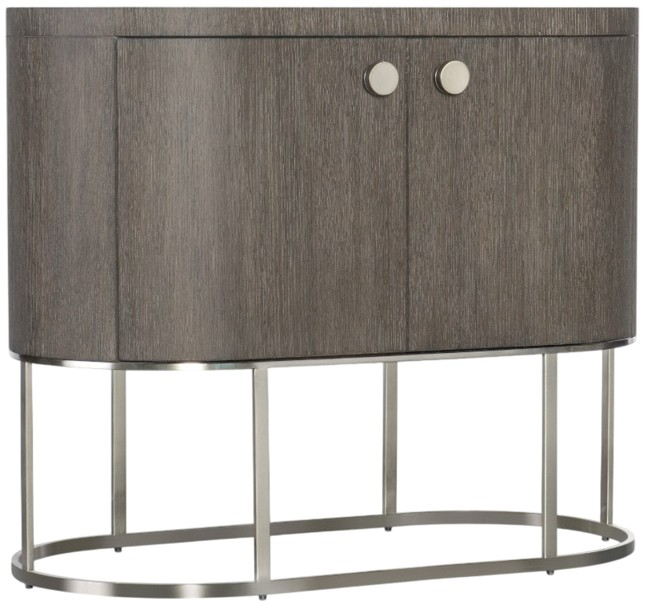 Architectural and timeless with a luxe mixture of materials, the Modern Mood oval nightstand is a statement piece. The shaped metal base gives the nightstand a floating appearance. Crafted with quartered oak veneers, the piece is finished in a serene dark mink color.Read More