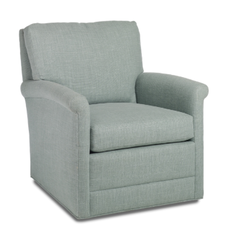 This Jacoby Swivel Rocker features an upholstered back and seat, photographed in H&M Megan Old Mint is available in your choice of fabric and wood finish.Read More