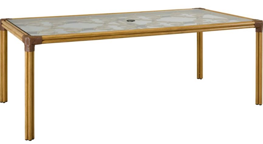 Features: Seats up to 8 chairs. Clear, heat-resistant tempered glass is inset over table top with 1.75" umbrella hole.