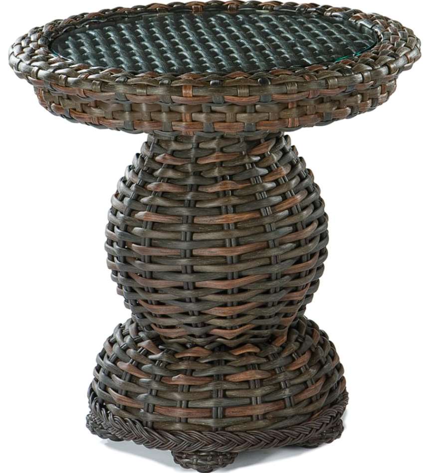 Features: Transitional design with a modern classic large scale weave. Pedestal base with woven top with inset clear, tempered glass tops.