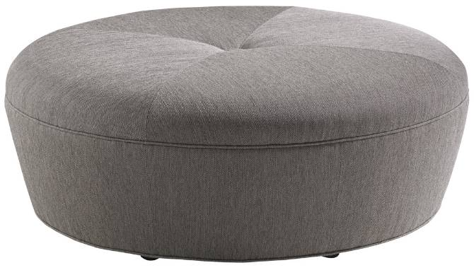 The ottoman features a round tight seat that tapers along the sides creating an original, designer look. The unique shape allows for ample seating arrangements around it. It is customizable and shown here in a modern grey toned fabric.Read More