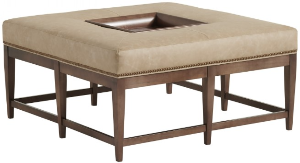 The Carillon Leather Cocktail Ottoman features your choice of fabric with a removable center tray. The upholstery finish selected for the tapered legs and base stretcher will also be applied to the tray.Read More
