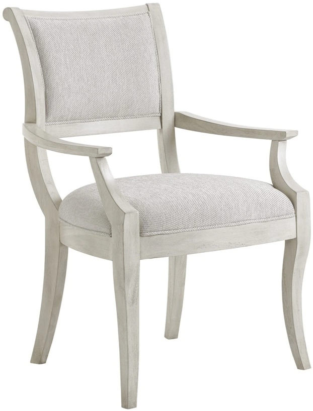 A gently distressed light oyster shell finish creates a beautiful contrast to the upholstered seat and back, which feature a textured basket weave pattern with shades of gray and ivory. A gently curved back and armrests ensure comfort.Read More