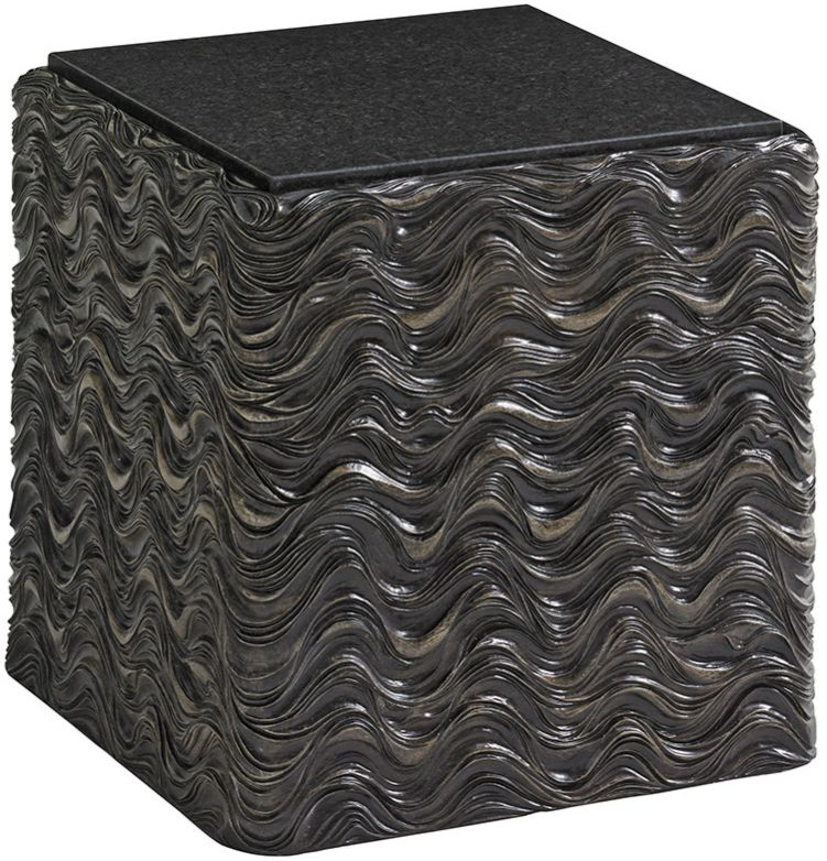 An irresistible piece that becomes the center of conversation. The intriguing wave pattern on the sides is cast and the top is honed black pearl stone. The piece functions beautifully as a single chairside table or in a grouping of two or four as a cocktail table.Read More