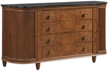 An absolutely stunning and updated rendition of a very traditional look, the burl wood drawers and Black Nero Marguina Marble top make the Barron Server a breathtaking addition to any dining space. Ribbed doors on each side hide six shelves, and the brass hardware adds to the classic look.Read More