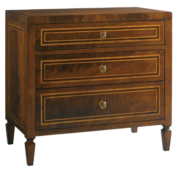Italian three drawer chest crafted with European walnut burl veneers accented with maple inlays. Aged finish with a soft patina. Make a bold statement to your living or bedroom area.Read More