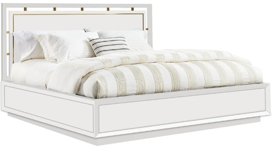 The Julien Bed features a white luxurious finish over the veneer, accented with brass on the headboard. The platform style base is designed with deep, mitered inset panels adding true artisan quality and highlighted with the brass plinth tying back to the headboard inset beading.Read More