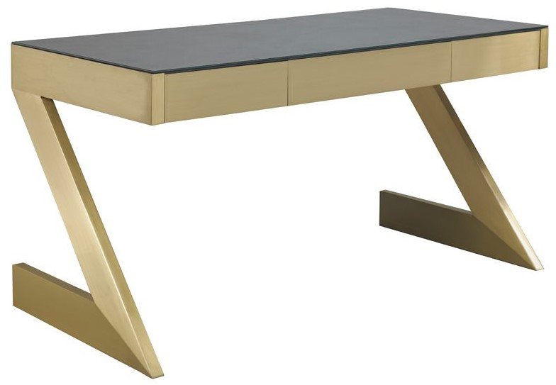 Classic contemporary Z-shaped writing desk fully metal clad in a polished brass finish with a very lightly aged mirrored top and three working drawers. Make a bold statement to your living area.Read More