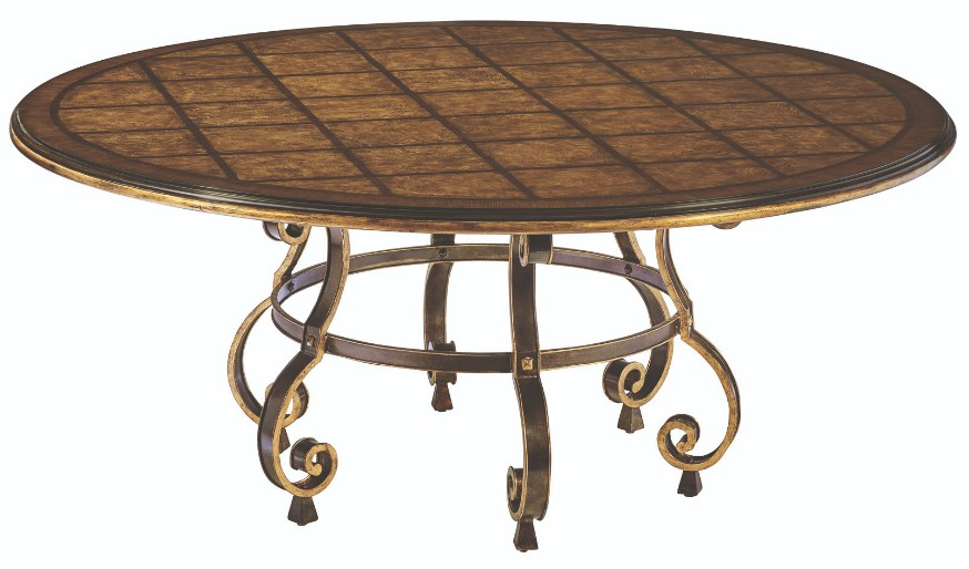 Mahogany Wood table top with Ash Burl veneer in an inlaid Versailles Parquetry pattern, finished in Aria. Metal base is finished in Bronze and features six scroll legs connected by a circular stretcher with Aged Gold details. Wooden and metal components are both trimmed in Aged Gold.Read More