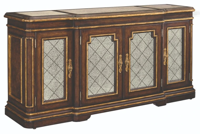 This Mahogany Wood credenza, in a combination of White Ash and Mahogany Veneer, features an Antique Mirror Top. Finished in Aria, the piece is trimmed in Aged Gold and paneled with Regency Glass in a diamond tile pattern. A combination of detailed Polished Brass and Nickel hardware open to reveal three adjustable shelves.Read More