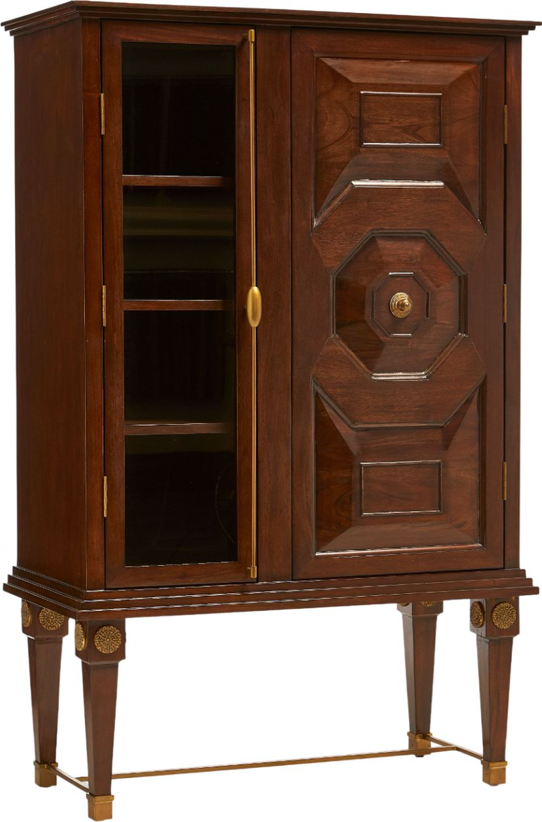 Mahogany bar cabinet in walnut distressed finish, with antique brass details and hardware