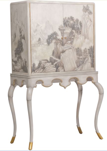 This Lacca Veneziana Bar Cabinet features a hand painted Chinoiserie in beige lacquer with gold leaf accents and soft brass .Read More