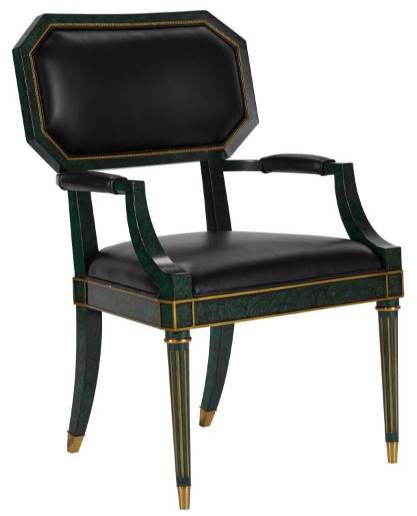 Introducing the Palagonia Desk Chair: Painted in faux malachite finish, adorned with Galileo Black leather upholstery, and softened with brass accents. This chair exudes opulence and sophistication, blending luxurious materials with elegant design, making it a statement piece for any stylish workspace.Read More