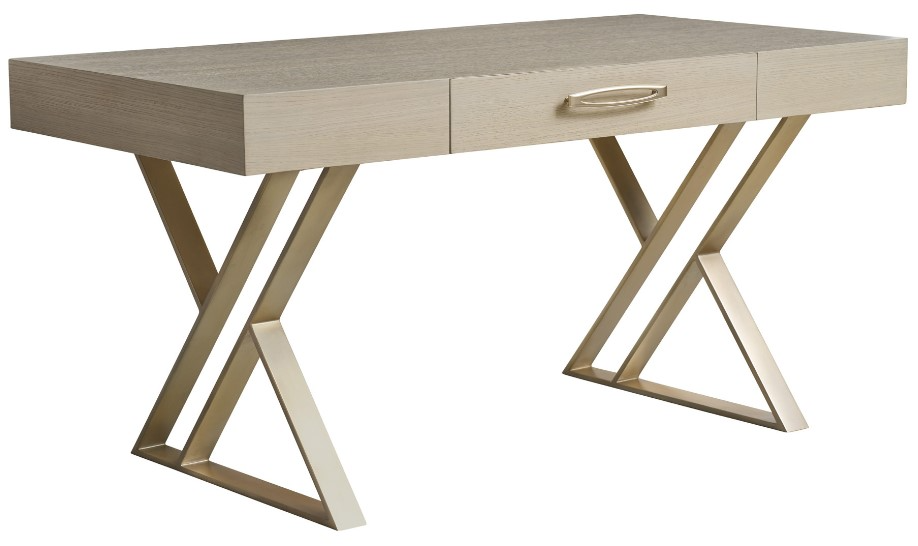 Contemporary home office designs crafted in white oak and select hardwoods in a Sandscape finish with gentle wire brushing. Decorative metal base and one full-extension storage drawer. Custom hardware features a champagne finish. The metal accents are in a silver leaf over champagne finish.Read More