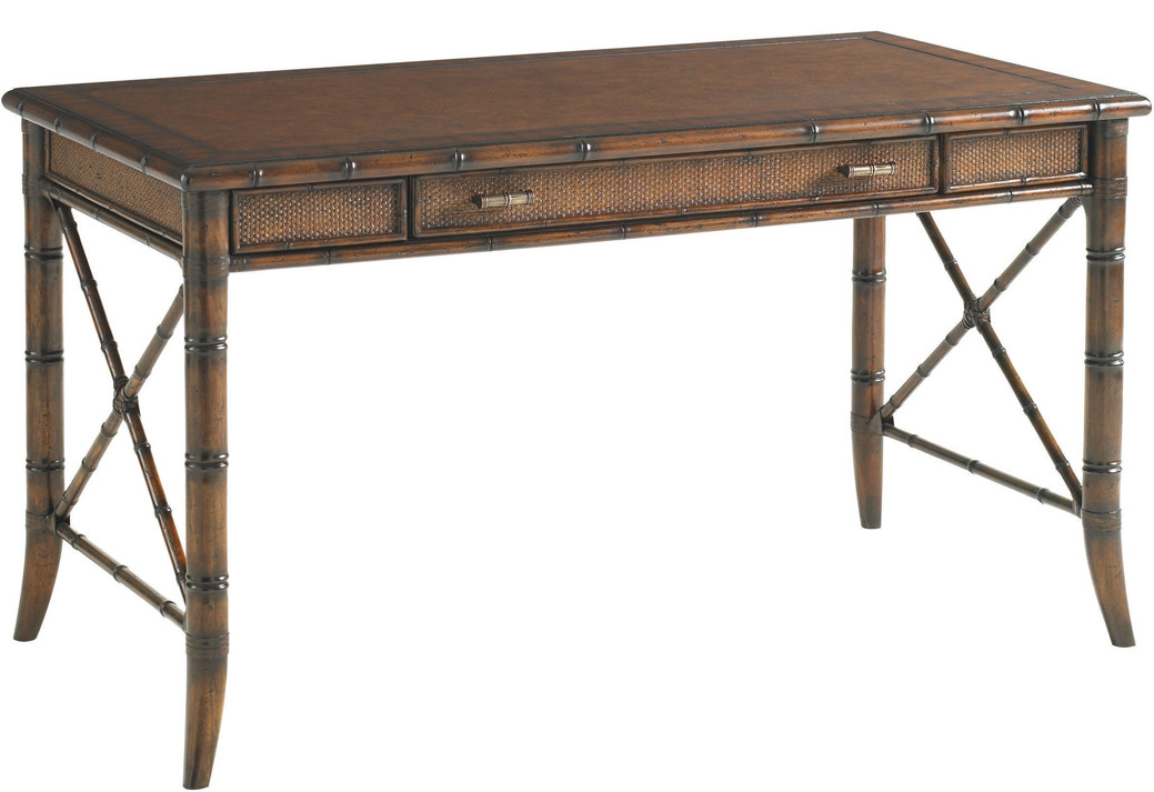 Rosewood veneer and rattan trim complement the rich leather writing surface, with woven rattan panels throughout. The drop front keyboard drawer with ergonomic palm rest and x-stretcher on both ends bring form and function to this desk.Read More