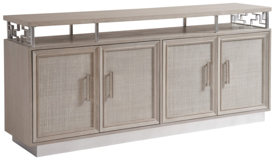 Floating wooden top with metal supports and contemporary designed decorative fretwork in a silver leaf finish on the ends. The three open areas for the sound bar or components are 17W + 36.75W + 17W inches and 4.75 high. The four doors open to an adjustable shelf behind each pair of doors.Read More