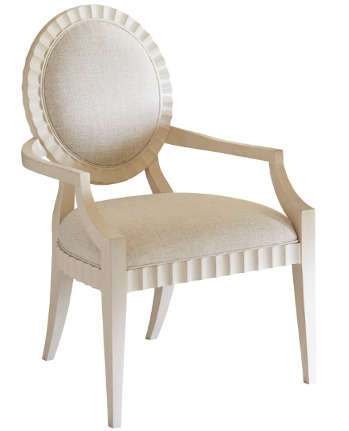 The scallped outside back and apron reflect the sunburst dimensional outback of the chair. The upholstered inside back and seat are standard in 222111 Chatfield, a wheat colored indoor performance fabric featuring a linen weave construction with a soft hand.Read More