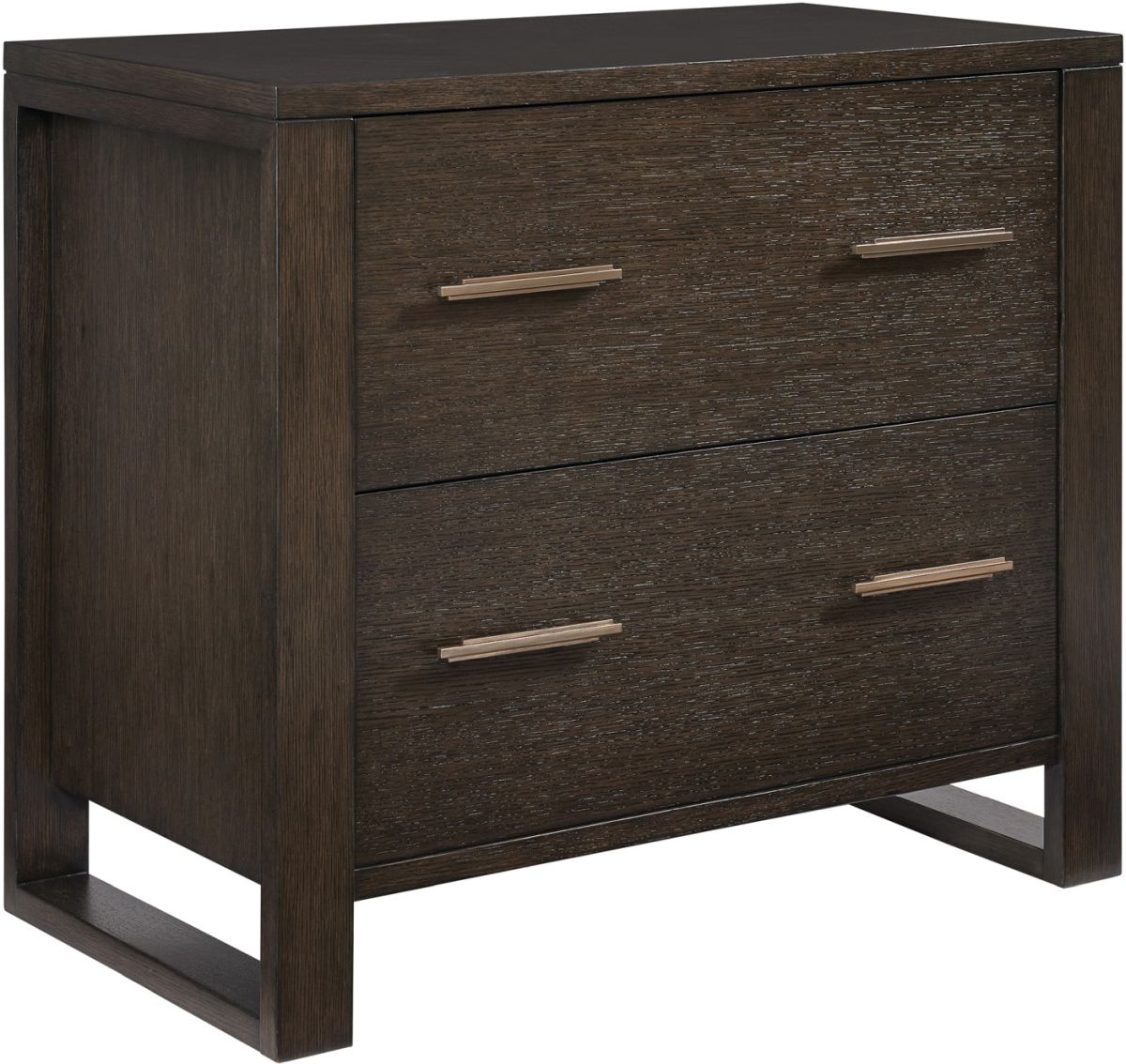 Two full-extension drawers for legal or letter filing. Open sled base design that extends vertically to frame the end panels. The linear drawer pulls are custom designed and finished in a champagne finish, complementing the dark walnut finish on quartered oak veneers.Read More