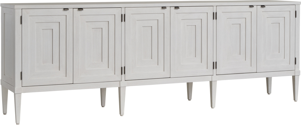 The Clearwater long media console features six front doors with a contemporary step-down design. Behind each pair of doors, two adjustable storage shelves provide flexible storage, combining modern style with functionality for a sleek and organized entertainment space.Read More