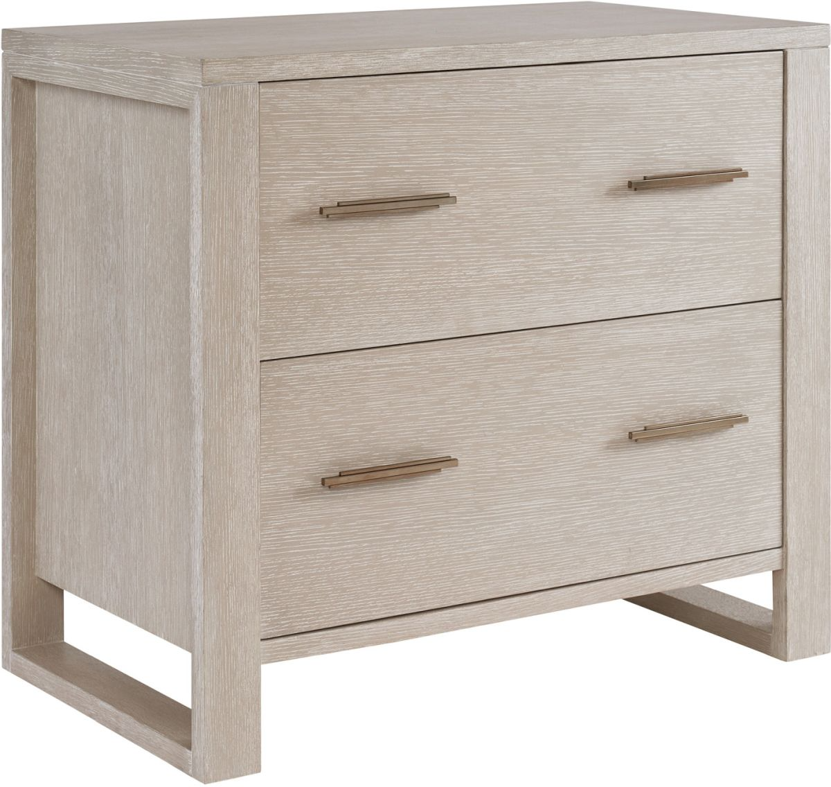 Two full-extension drawers for legal or letter filing. Open sled base design that extends vertically to frame the end panels. The linear drawer pulls are custom designed and finished in a champagne finish.Read More