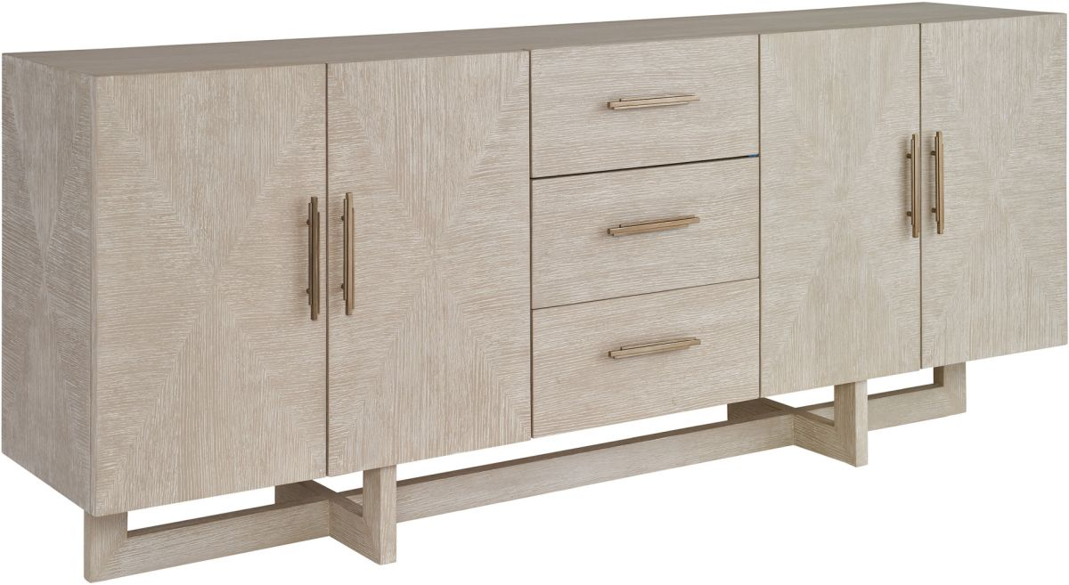Contemporary open trestle base. Four doors with diamond match veneer pattern open as pairs to two adjustable shelves behind each pair, with a ventilated back, and cord management. The center has three soft-closing drawers with flat cut veneer patterned fronts. The custom designed linear stacked hardware is finished in a complementary champagne coloration.Read More
