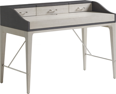 The 48-inch Anthology writing desk blends a linen-wrapped deck in a slate coloration with a top and base crafted from eucalyptus veneers in a dove gray finish. The writing surface pulls out to expose storage compartments beneath. Three drawers in the deck feature custom acrylic hardware.Read More
