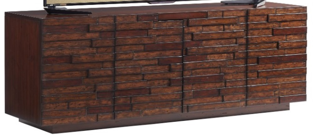 Five different wood species create the color and grain variation on the door panels. The four doors open with a top finger pull to reveal four adjustable shelves, two beind the center pair, one behind each outer door.Read More