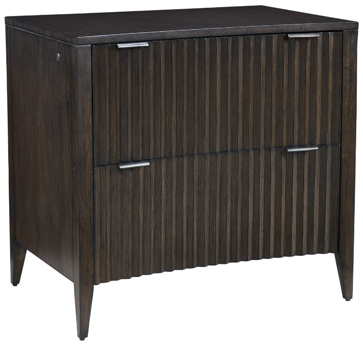 Transitional designs crafted from quartered oak veneers and select hardwoods in a dark walnut finish and custom hardware in a pewter finish. The two locking full-extension file drawers accommodate legal and or letter size files. The soft concave shape is highlighted with undulating drawer fronts.Read More