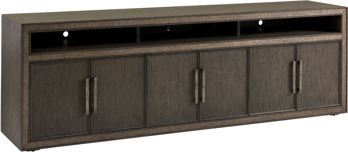 Transitional design in a graphite finish crafted from heavily sandblasted oak veneers, with striking custom hardware in a nickel finish with a dark glaze. Textured cast inlay, partitioned open compartment for sound bar storage, and grommet for cord management. Six doors with ventilated back.Read More