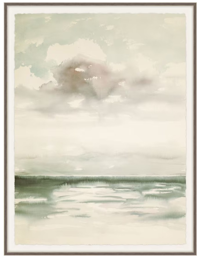Sea Breeze I presents a calm coastal landscape view of the natural wonders of land and sky. Various light hues define the cloudy day with an ivory, sand, and vanilla color theme. A hint of mauve adds depth to a large cloud. Pops of moss green with a swath of cream define the shore.