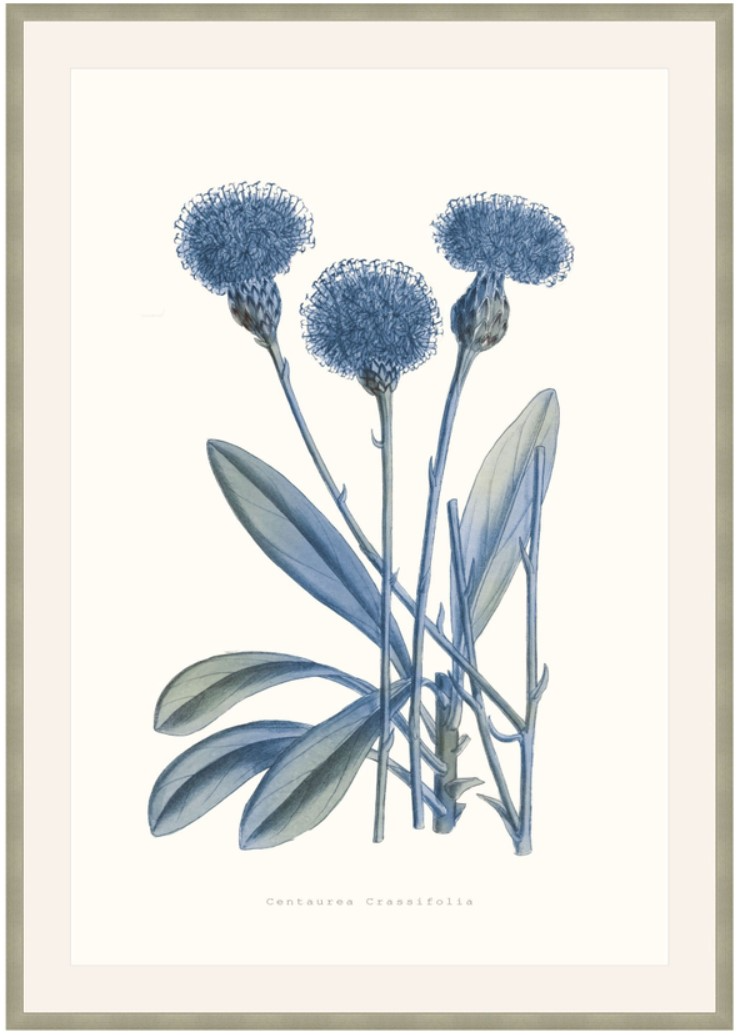 In Bouquet Blue 1, three centaurea crassifolia flowers, commonly known as the Maltese rock-centaury, form a beautiful bouquet. Using a calming palette of slate blue, ash, and cool grey, long, leafy stalks grow into a magnificent floral form in this beautiful addition to ART by TA.Read More