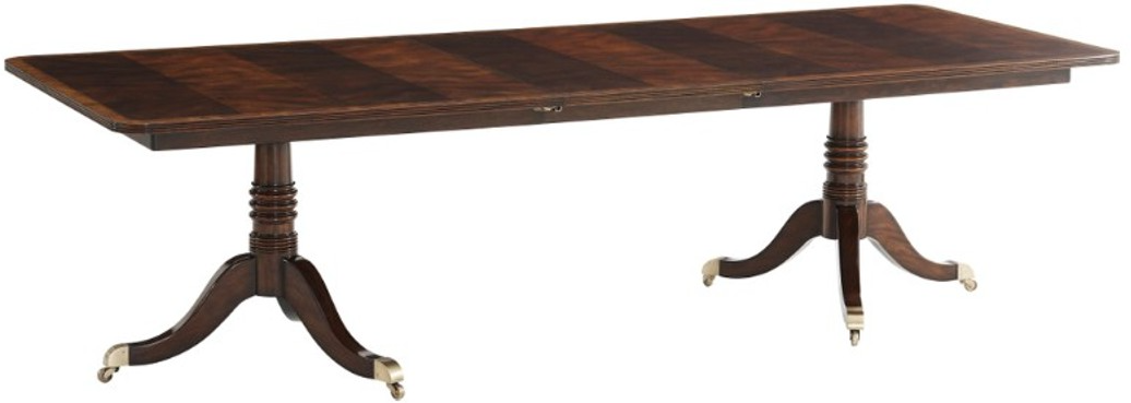 A swirl mahogany veneered dining table, the rectangular reeded edge and satinwood banded top extending to accommodate one additional leaf, on two gun-barrel turned column pedestals with downswept legs terminating in brass cappings and castors. Inspired by a Regency original.Read More