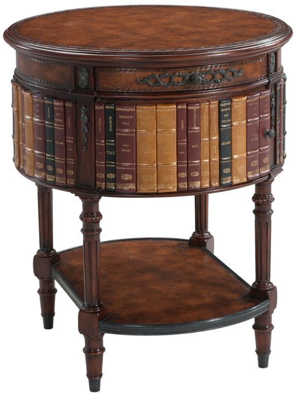A faux book panel circular lamp table, verdigris brass mounts, aged brown leather top and undertier, drawer and cabinet, turned fluted legs. The original Louis XVI. Its surface is ideal for holding small items, while the polished base adds a subtle contrast for a balanced, practical look.Read More