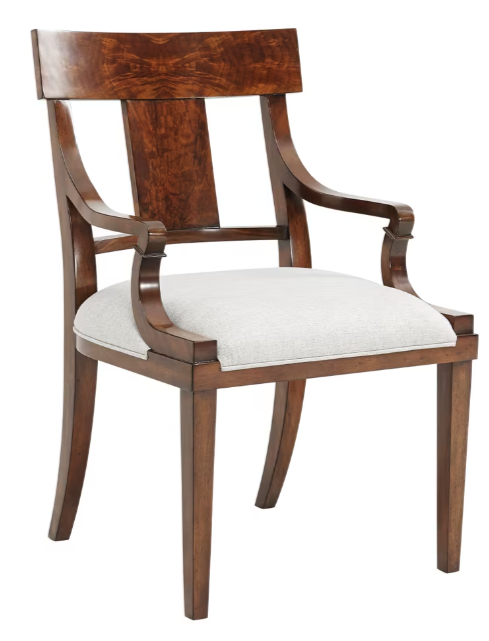 A mahogany armchair featuring a flame-veneered bar top rail and solid splat, offering a striking visual contrast. The upholstered seat provides comfort, while square tapering legs add a sense of balance and structure. A refined design from the TA Originals Eternal Flame collection.Read More