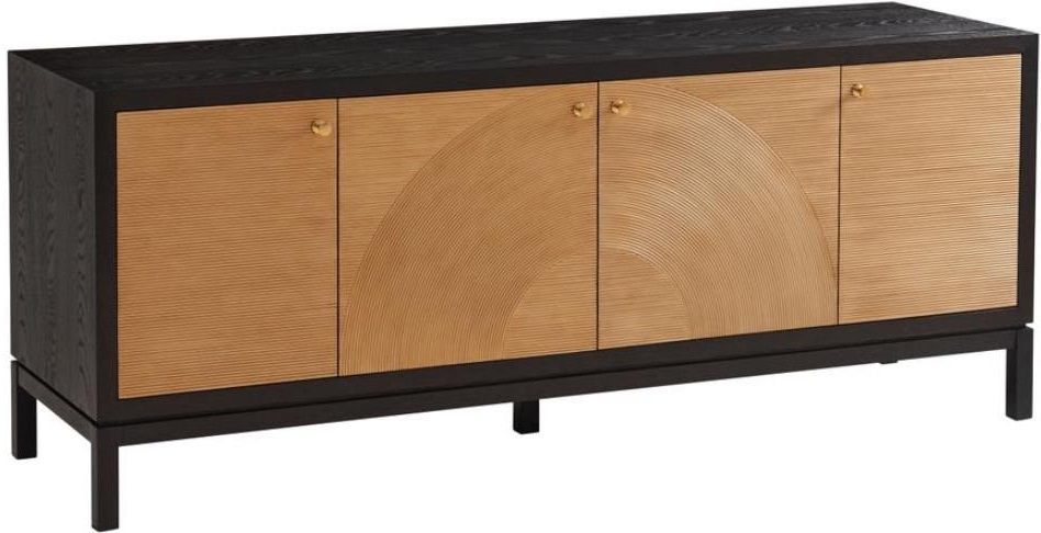 This buffet combines ebony-toned and brown finishes on a refined profile, featuring storage behind subtly detailed doors and drawers. Elevated on a sturdy base, it provides ample space for serving essentials and stylish organization in dining areas.Read More