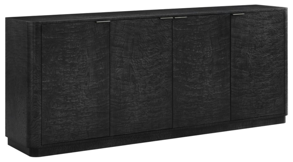 Theodore Alexander's Kesden silent black/brass 86" sideboard showcases a stunning tamo ash burl veneer, offering bold texture and depth. With four doors and sleek brass accents, it serves as a sophisticated storage solution and a striking focal point in any refined dining space.Read More