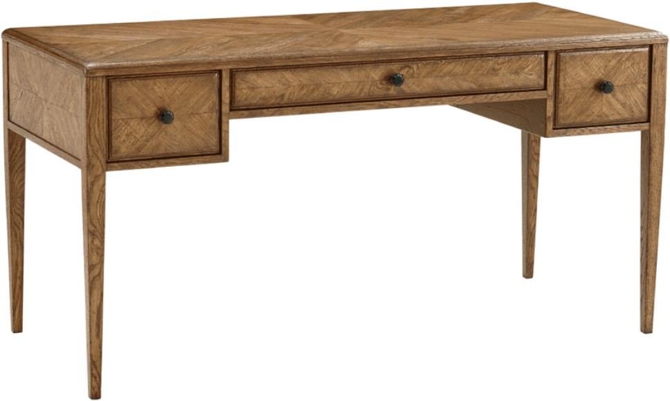 A divine place to write and work, this delicately crafted writing desk maintains a starburst patterned oak parquetry design from top to bottom. The Nova desk possesses a central drawer flanked by two further additions. Shown upon a tapered oak leg with Verde Bronze finished handles.Read More