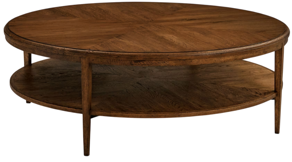 The Theodore Alexander Nova dusk round cocktail Table features a bold two-tiered design with handcrafted concentric oak veneer on both top and bottom shelves. Finished in rich dusk, it rests on elegantly tapered oak legs, combining modern form with artisanal detail for a refined living space centerpiece.Read More