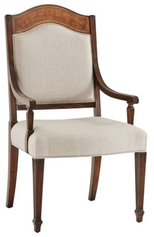 A fine mahogany, satinwood and walnut burl veneered dining chair, the arched back with a finely veneered arched toprail between reeded uprights and above a padded back and bowed seat, on reeded square tapering legs with spade feet. Inspired by an 18th century original by Thomas Sheraton.Read More