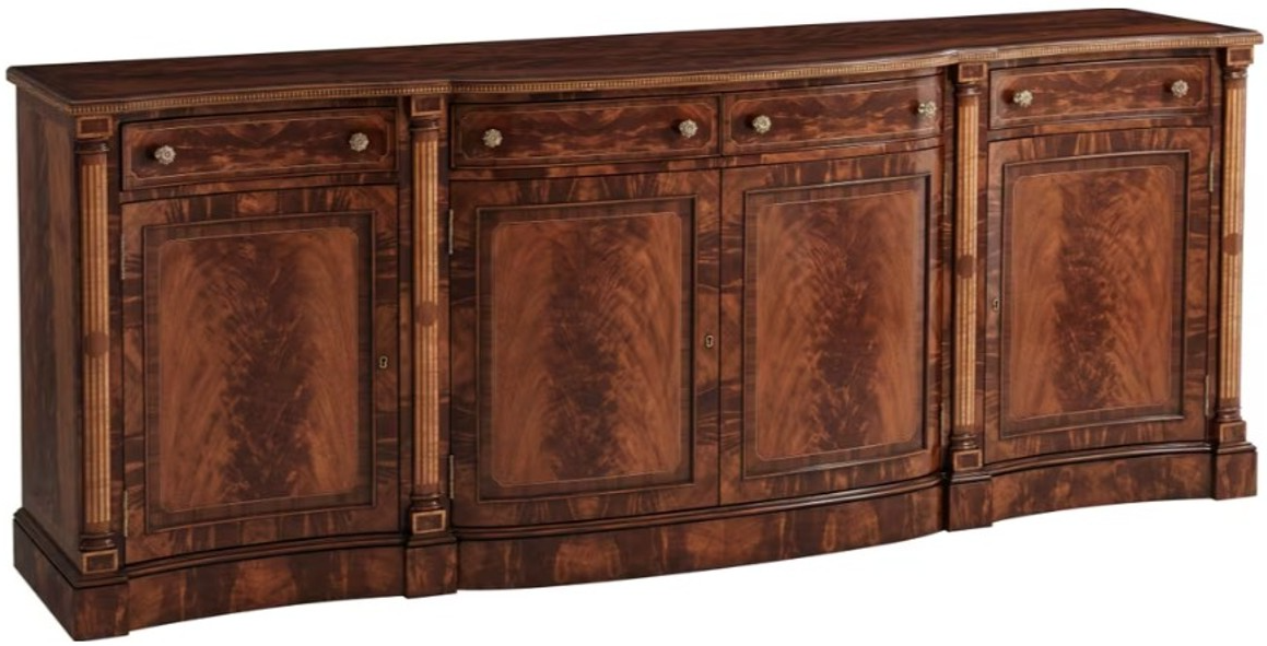 A flame mahogany and Morado banded sideboard with fine double stringing in sycamore and ebony, the serpentine crossbanded top above four frieze drawers, above four paneled cabinet and lockable cabinet doors flanked by fluted inlaid rounded columns, on a shaped plinth base.Read More
