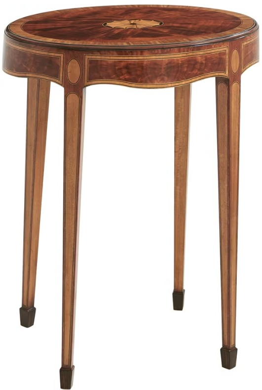 An oval flame veneered accent table, the oval fan inlaid, satinwood banded and line strung top with a caddy molded edge and an undulating inlaid apron, on satinwood inlay paneled square tapering legs terminating in spade feet.Read More