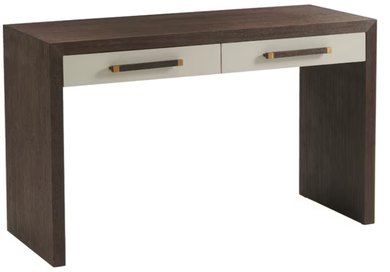 Crafted from beech wood with lati veneer in a cardamon finish, this 49" writing table features an arctic smoke top and two leather-wrapped frieze drawers. Brushed metal accents and panel-style end supports enhance its sleek, refined appearance while offering functional workspace.Read More