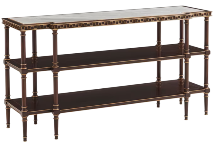 Alexa Hampton brings new life to a classic console table with amazing attention to detail. The Bianco Carrara marble breakfront top is framed in Mahogany with Greek key decoration. The shape is reprised in the lower tiers. Eight turned legs with gilt banding bring it all together, beautifully.Read More