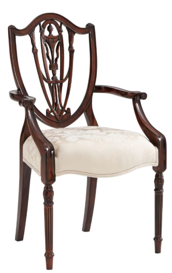 Inspired by George Hepplewhite, this armchair features a shield back with a finely carved vase splat, adding elegance to its classic form. The upholstered seat offers comfort, while turned, fluted tapering legs in a walnut finish complete its timeless appeal.Read More