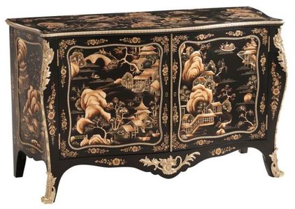 An exceptional black Chinoiserie lacquered serpentine commode, the richly hand-painted top of Chinoiserie landscapes and floral details above an cast brass floral decorated edge and two finely cast brass molding paneled doors enclosing a burgundy interior with one long adjustable shelf.Read More