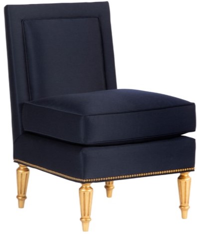 Perfect in pairs, this armless chair is tête-à-tête ready. This slipper chair features a loose boxed-cushion seat. The tight seat back with picture-frame detailing delivers style. Upholstered seat deck is trimmed in nail heads. This low-slung chair is set on turned, fluted and gilt tapering legs.Read More